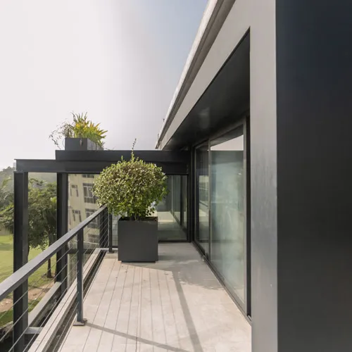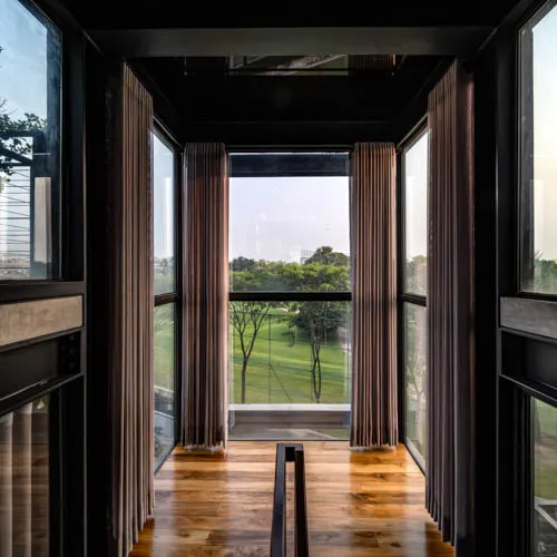 Designed as a modest single family residence, the home employs a composite structural system featuring steel vertical columns and fair-faced exterior walls. Oriented along a north-south axis, it opens generously to southern views of the adjacent golf course, inviting natural ventilation and enhancing spatial comfort.