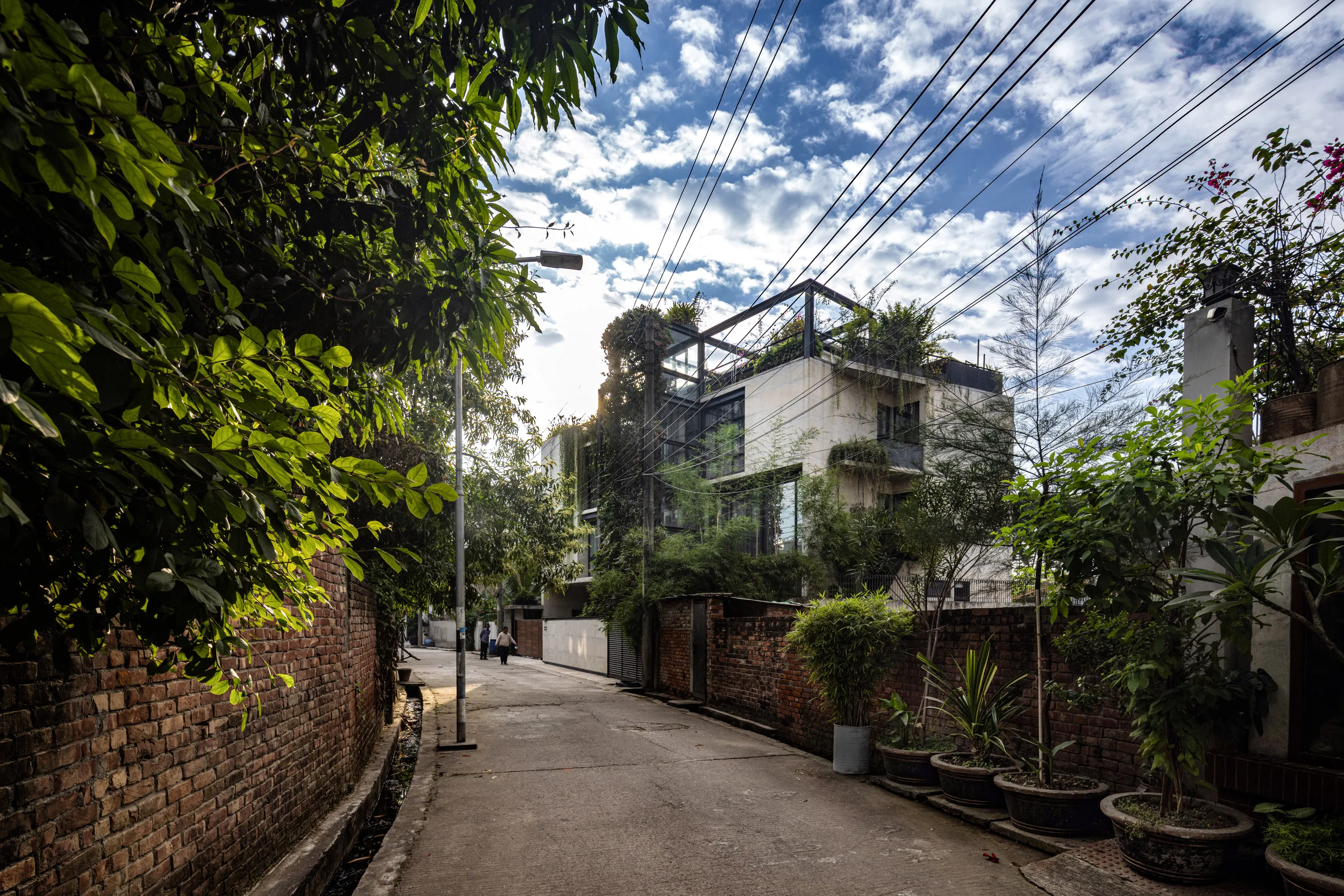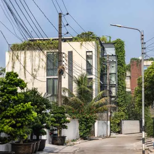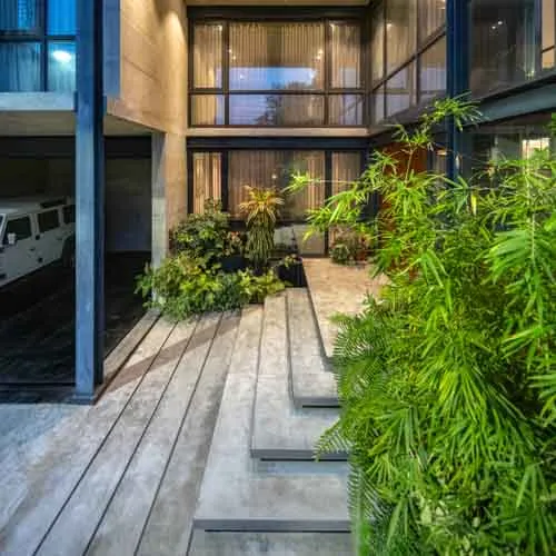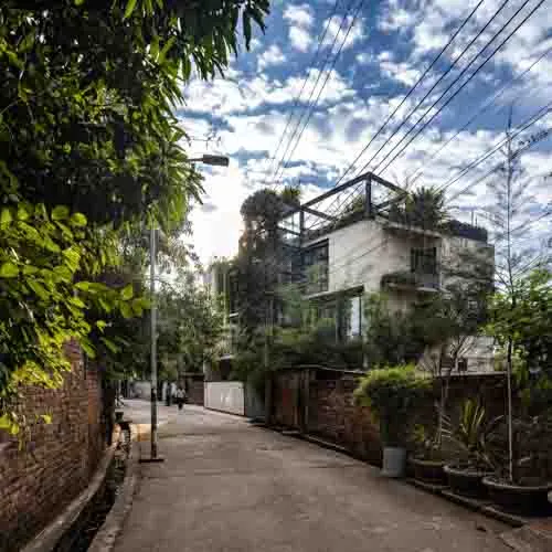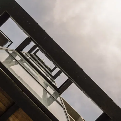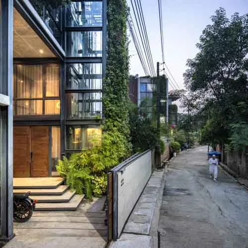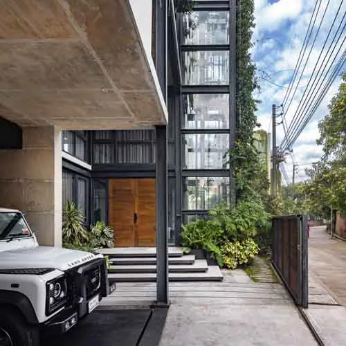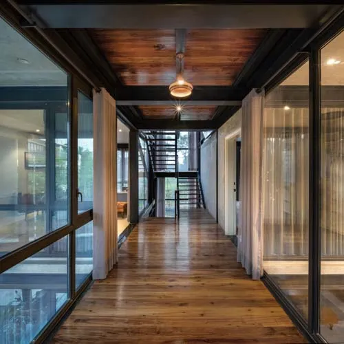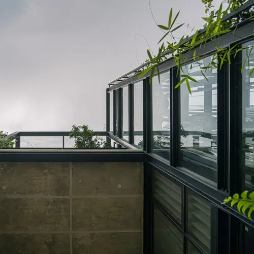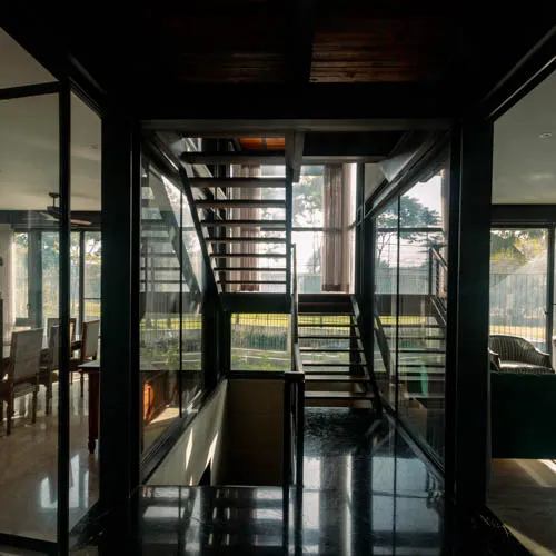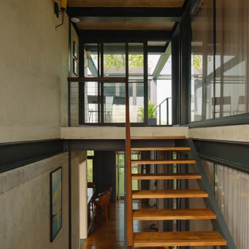 Despite its compact footprint, the design integrates all essential functions within a restrained vertical volume. Expansive openings blur the boundary between interior and exterior, fostering a serene, light-filled environment conducive to mental and social well-being. A central core intersects the layout, echoing plugin-inspired design elements with full-height glazing that visually connects the staircase to the outdoors, enriching the living experience. Verandahs, conceived as modular insertions, punctuate the structure with lightness and rhythm. The interplay of steel framing and exposed fair-face walls yields an uncluttered, spacious interior while ensuring a harmonious dialogue with its natural surroundings.