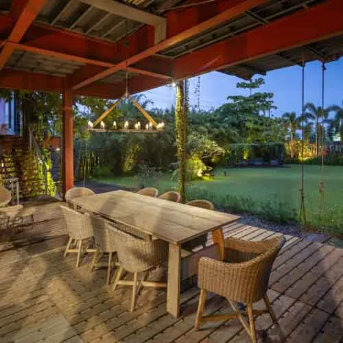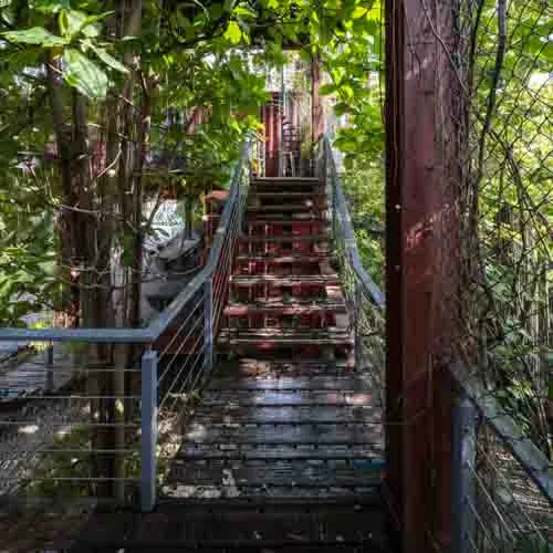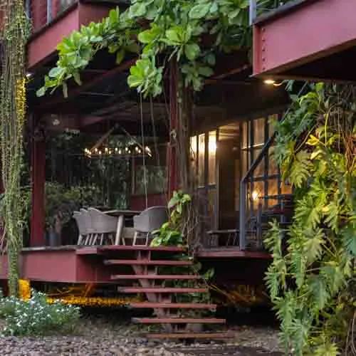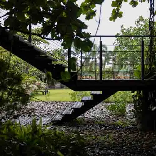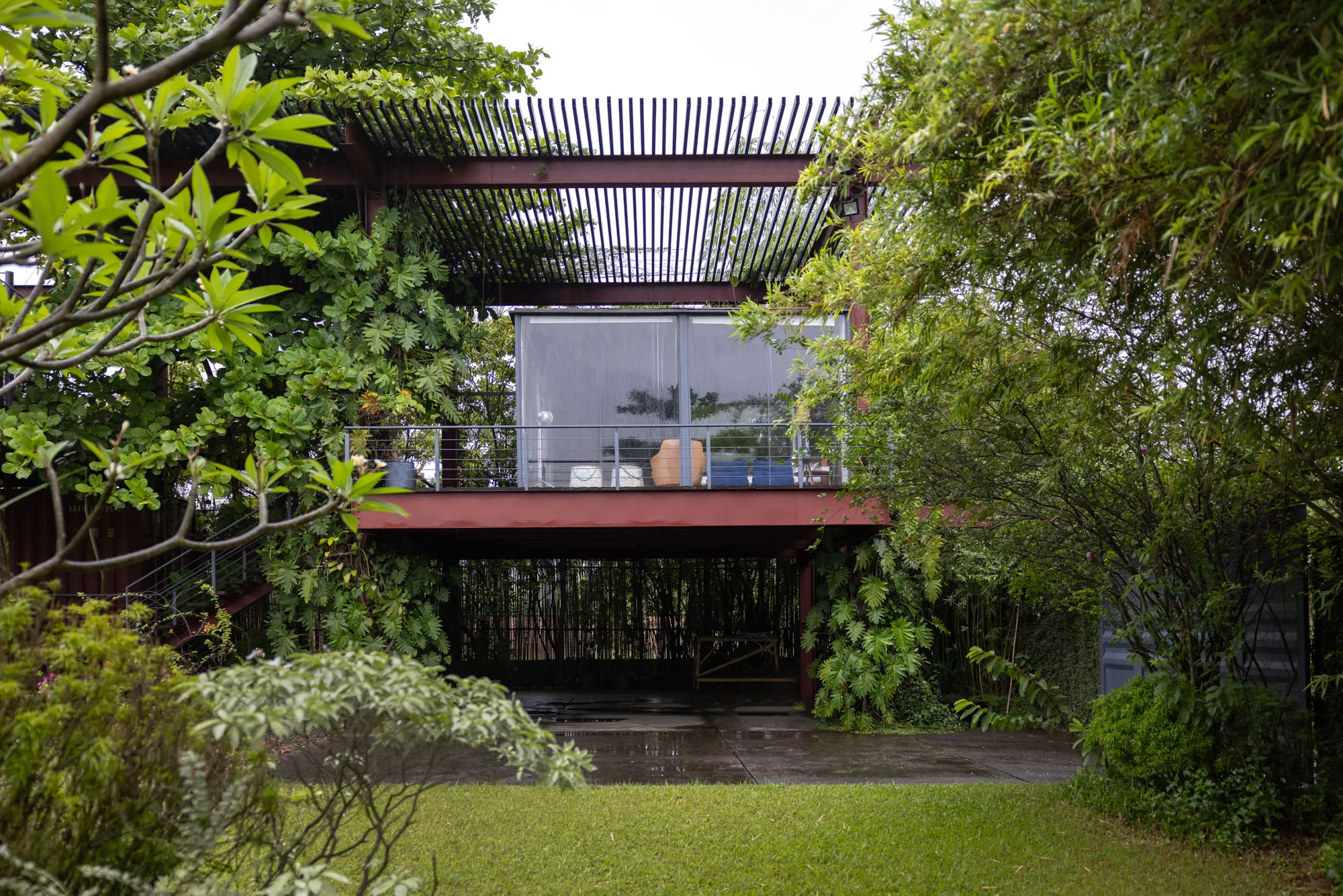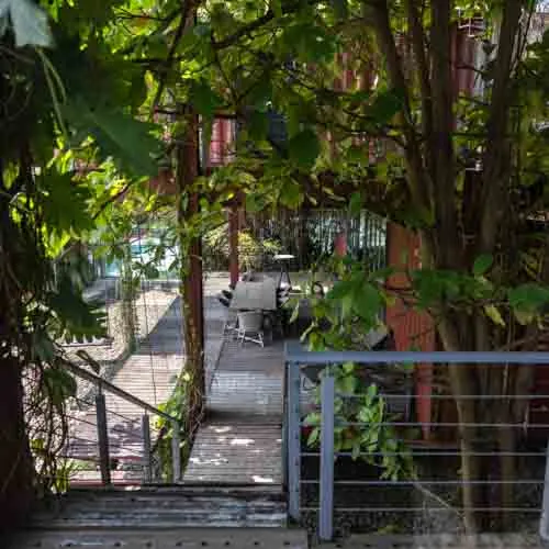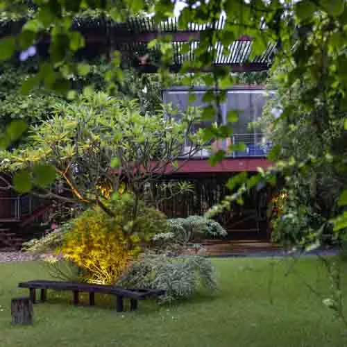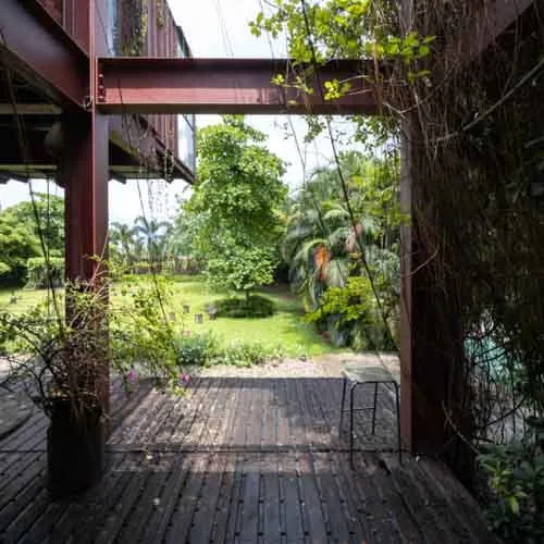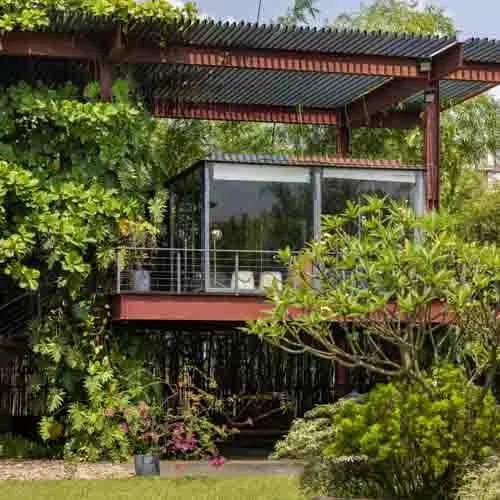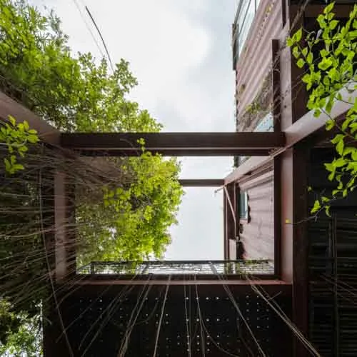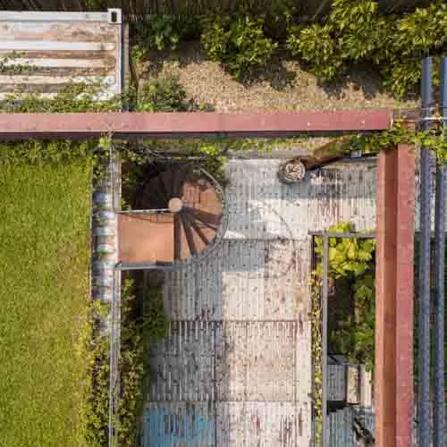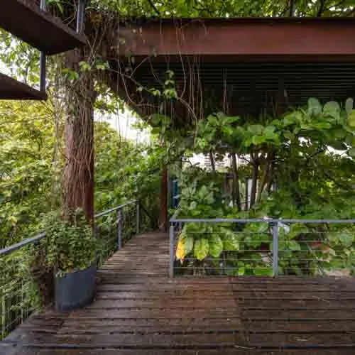 The rusty facade prone to weathering accompanied by an array of vegetation left and right mimics the earthy toned aesthetic that evolves over time. Thoughtful design details, varied orientations and floating platforms supported by intertwining stairs aid to reduce the hefty look of the structure. With minimal landscaping and a broad front yard, accentuating the presence of the build form, the entirety serves fit as the ideal serene abode.
