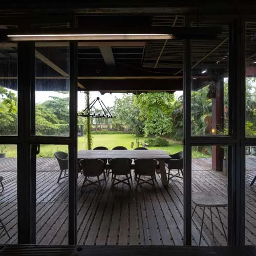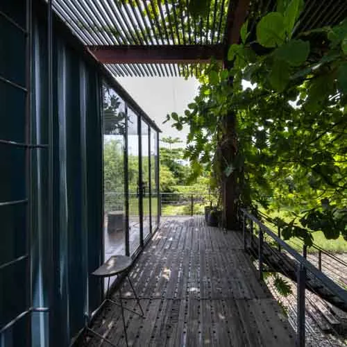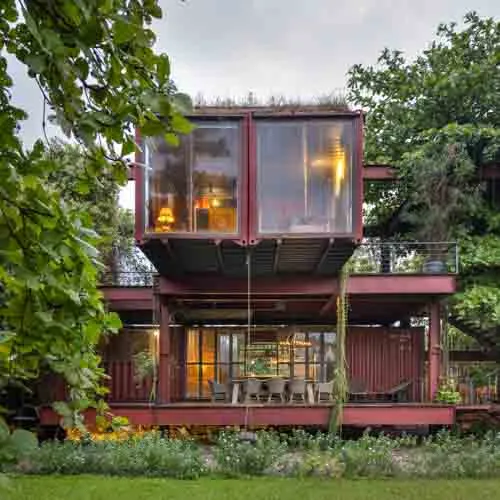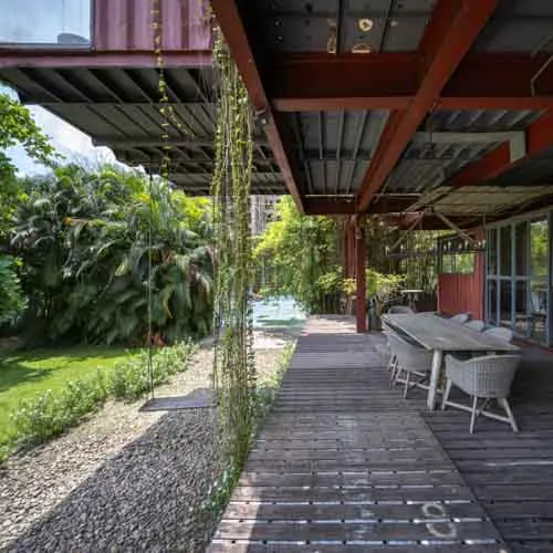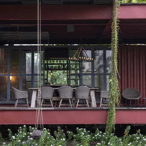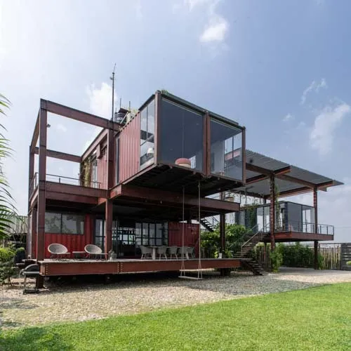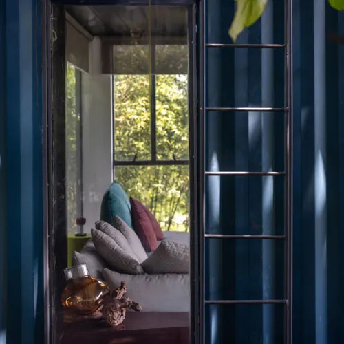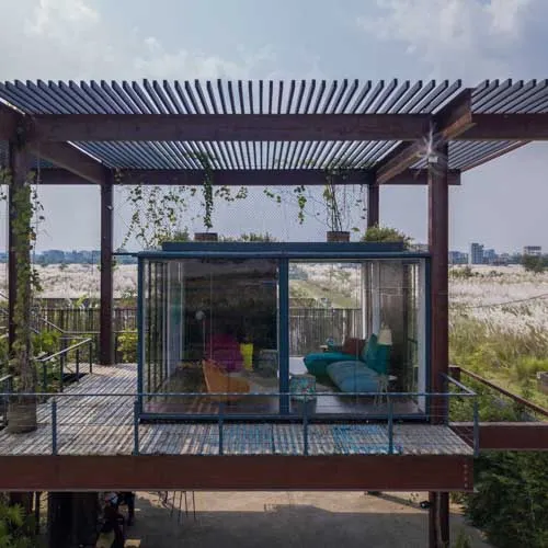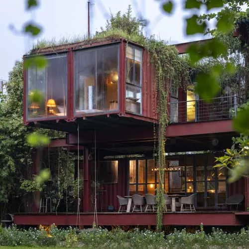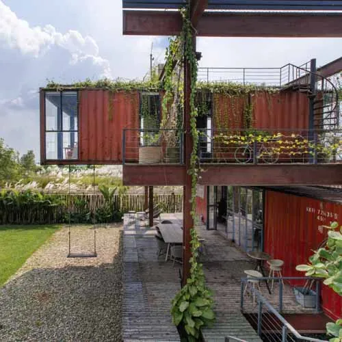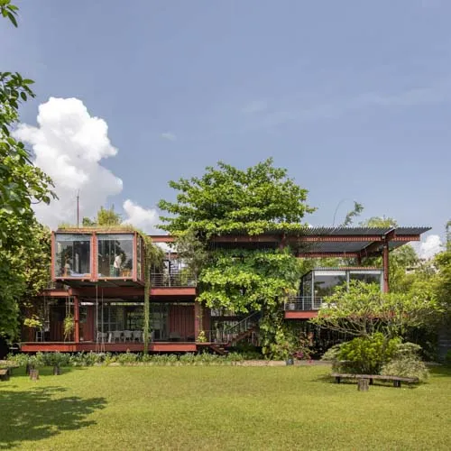 Set within a sprawling open landscape, the design draws inspiration from traditional homes, emphasizing horizontal spatial relationships—like open courtyards and detached functional zones—reimagined through modular container units. Supported by a skeletal structure of steel, the container boxes are arranged in interlocking perpendicular patterns forming various pockets of spaces and a courtyard that exhibit an airy presence keeping in tune with the open land.