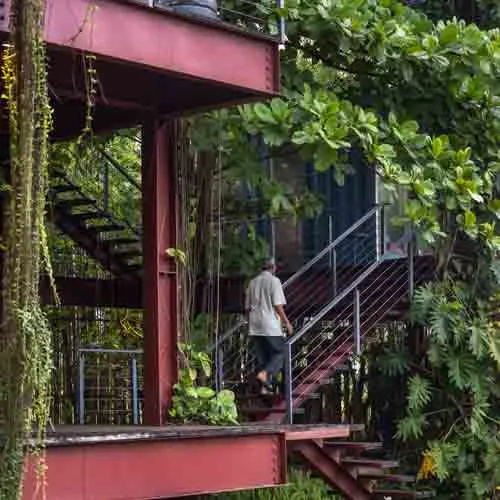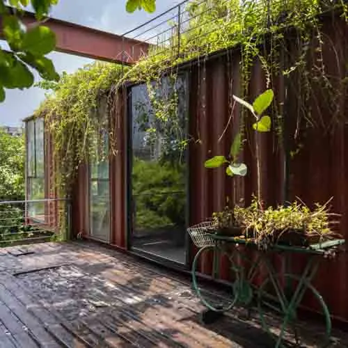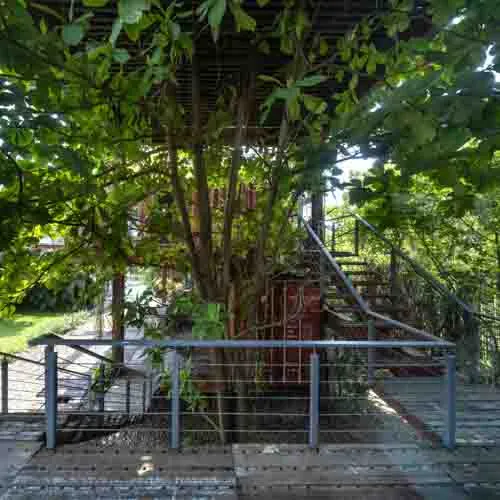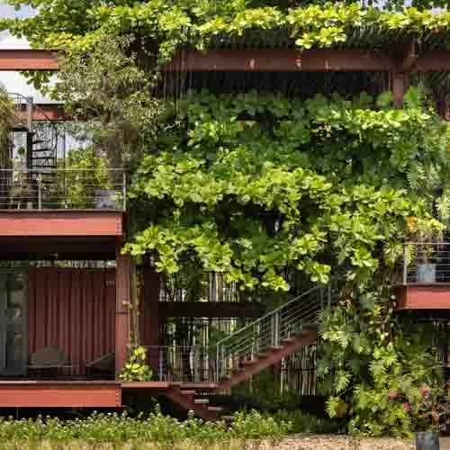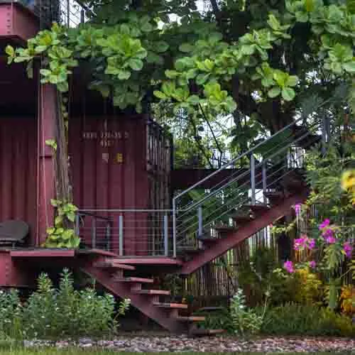 Prospects of future functionality forging integration with nature, led to utilization of reclaimed shipping containers with a modular design proposition which is open to further modifications, would help reduce carbon footprint and cost. A leafy cloak, grown over time, atop the container roofs act as natural insulation, while branches and foliage of the surrounding trees slowly weave into the corners and crevices that seep onto the open terraces. With a triple height atrium upon entry, greeted by the almond tree and cascading green veil, evokes an inviting ambiance into the design.