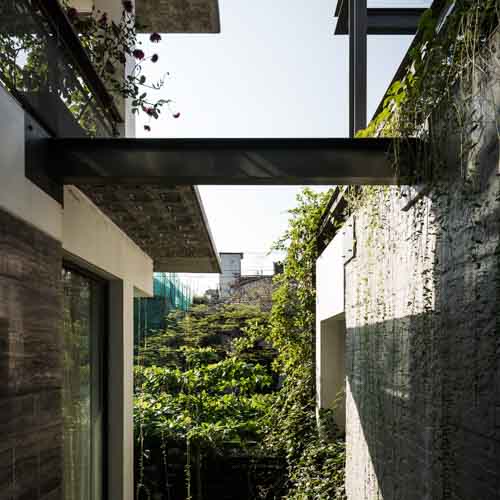 The residence presents as a grand home with a lush lawn and a charming koi pond retained from the original site. An old septic tank was creatively transformed into an elevated garden, while exposed, treated brick walls preserve the building’s history. Creepers and plants soften the exterior walls, beams, and columns, blending nature with architecture.Inside, a natural palette of browns and greens dominates, accented by warm tones and polished marble floors.