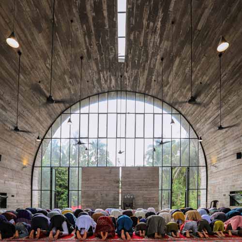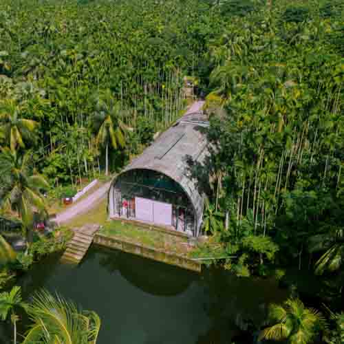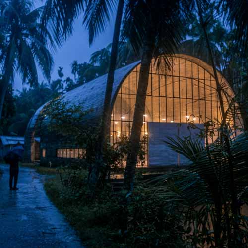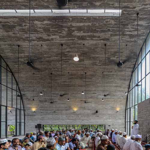 Nestled within the lush rural landscape of Lakshmipur, this modest rectangular mosque embraces simplicity and spiritual profundity. The design was conceived with two pivotal thoughts: creating a column-free volume and a space with an essence of infiniteness. The goal was to provide a barrier-free mono-space for a deep spiritual sojourn, amplifying solemnity through its vaulted roof. This architectural choice creates an essence of infiniteness, consciously elevating the mind towards a submissive strata towards the infinite existence of one’s creator. The absence of columns instantaneously eliminates spatial noise and secures spiritual calmness, allowing for a silent play of light and shadow throughout the day. slit openings in the north-south direction and within the vaulted roof ensure natural ventilation, while the curvature of the vault reflects heat, maintaining a cooler inner sanctum. An off-centric eastern entrance carves out a transversal portion of the vaulted mass, creating an open-sky preparation space before leading into the main prayer hall in the west. The transparent western facade, intentionally open to an adjacent pond, acts as a spatial buffer, casting a silent play of light and shadow and accentuating the vista as an essence of infinity.