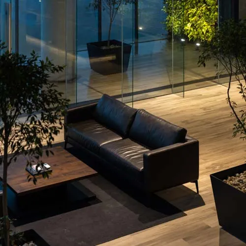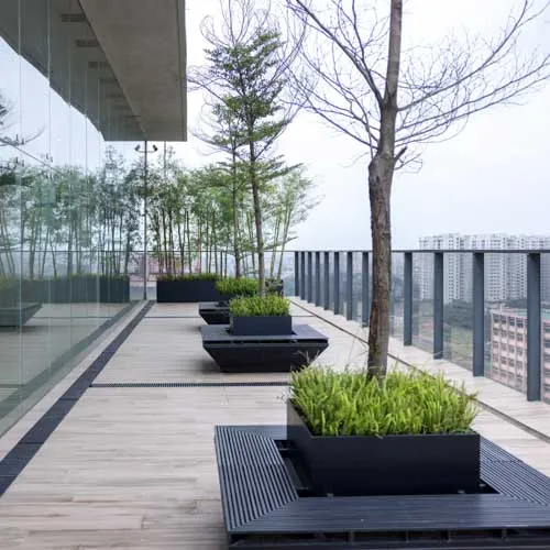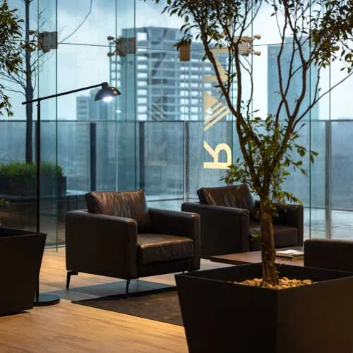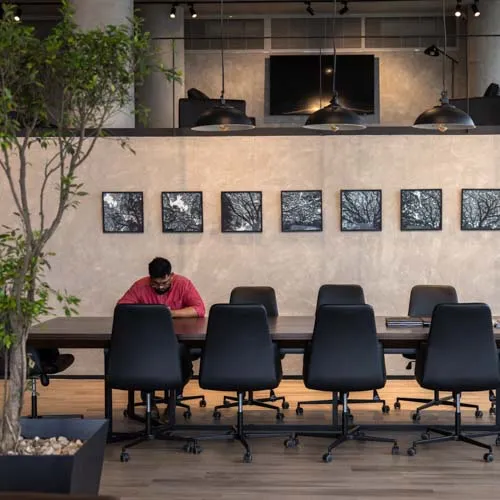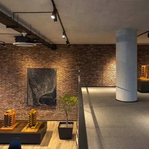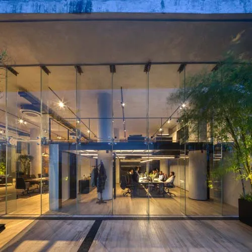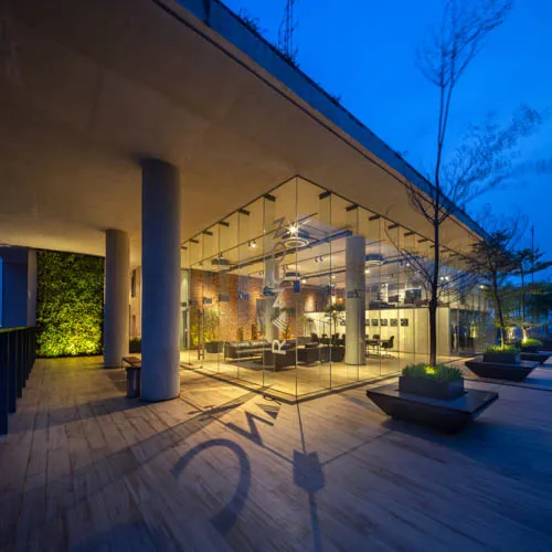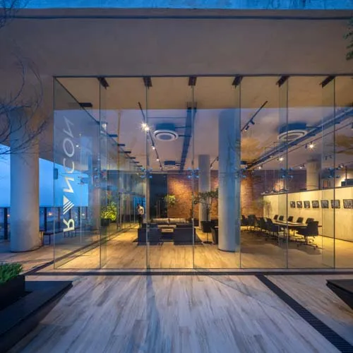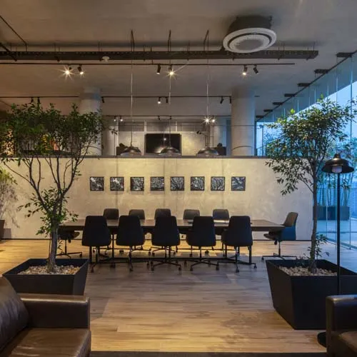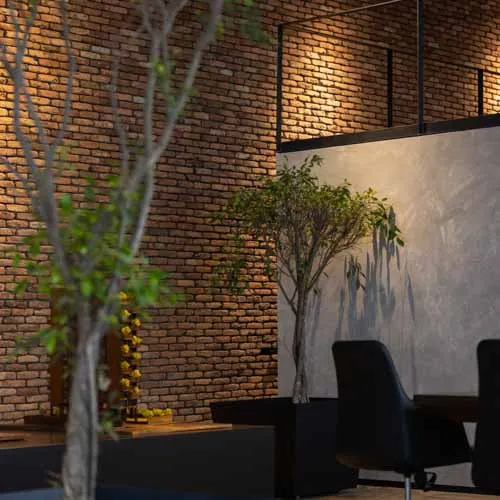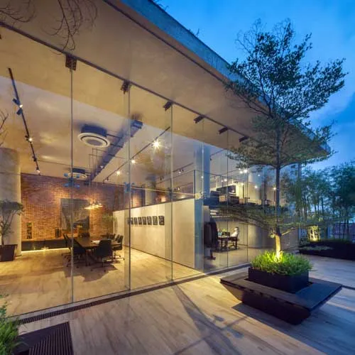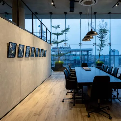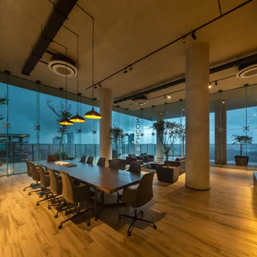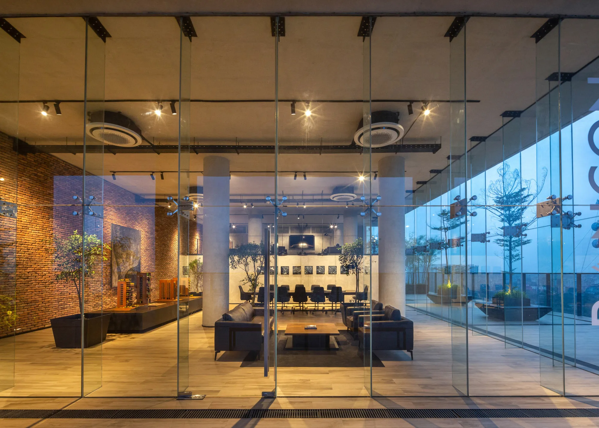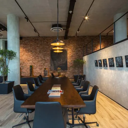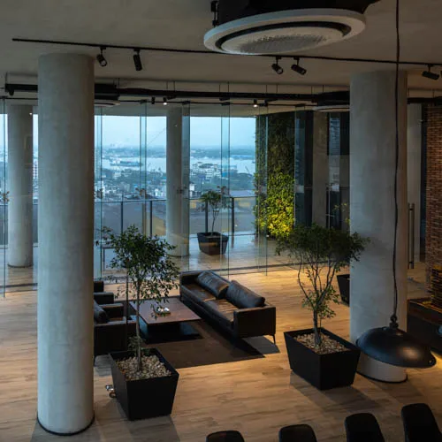 The renovated corporate headquarters of ranks FC Properties in Chittagong, Bangladesh, reimagines a rooftop space into a vibrant meeting hub with a contemporary rustic-industrial flair. Perched above the city, this double-height design features a transparent glass facade that frames stunning views of Chittagong’s skyline and the Karnaphuli River, reflecting the developer’s focus on urban growth. The ground-level lobby serves as a welcoming waiting area and exhibition space, showcasing architectural models of the company’s projects. A standout feature is the recycled brick wall, etched with a Chittagong map, blending heritage with sustainability, while skim-coated walls and vertical gardens add natural texture and greenery indoors. The loft level extends the layout with flexible meeting rooms and lounges, connected by a sleek staircase. Wooden tile flooring flows seamlessly from inside to the outdoor lounge, where trees in custom planters with metal benches create a green oasis. Pendant and track lighting enhance the raw materials, casting a warm ambiance that highlights the design’s earthy tones. The integration of indoor plants and outdoor vistas fosters a connection to nature, making this rooftop headquarters a striking testament to modern architectural adaptability in an urban context.