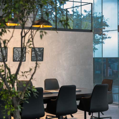 The renovated corporate headquarters of ranks FC Properties in Chittagong, Bangladesh, reimagines a rooftop space into a vibrant meeting hub with a contemporary rustic-industrial flair. Perched above the city, this double-height design features a transparent glass facade that frames stunning views of Chittagong’s skyline and the Karnaphuli River, reflecting the developer’s focus on urban growth. The ground-level lobby serves as a welcoming waiting area and exhibition space, showcasing architectural models of the company’s projects. A standout feature is the recycled brick wall, etched with a Chittagong map, blending heritage with sustainability, while skim-coated walls and vertical gardens add natural texture and greenery indoors. The loft level extends the layout with flexible meeting rooms and lounges, connected by a sleek staircase. Wooden tile flooring flows seamlessly from inside to the outdoor lounge, where trees in custom planters with metal benches create a green oasis. Pendant and track lighting enhance the raw materials, casting a warm ambiance that highlights the design’s earthy tones. The integration of indoor plants and outdoor vistas fosters a connection to nature, making this rooftop headquarters a striking testament to modern architectural adaptability in an urban context.
