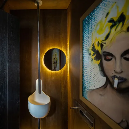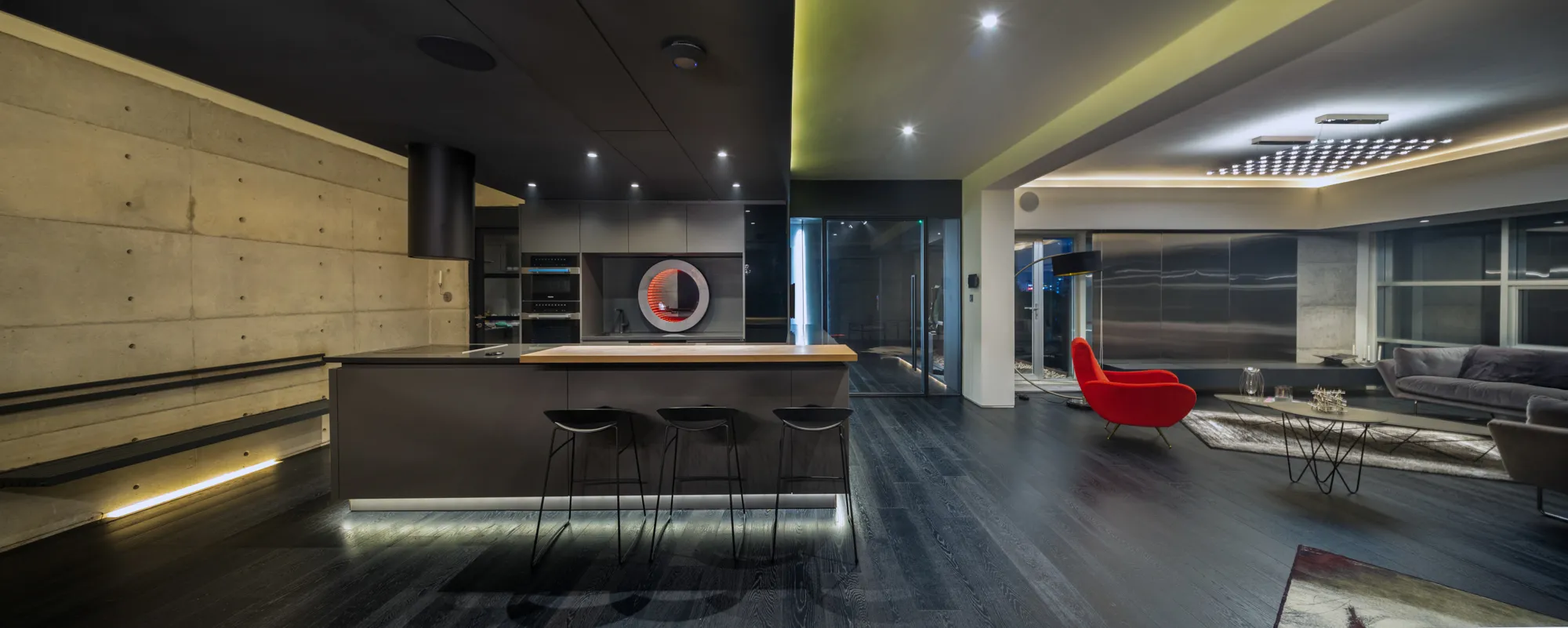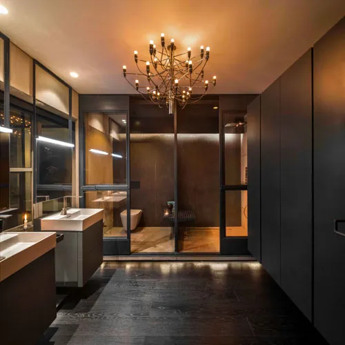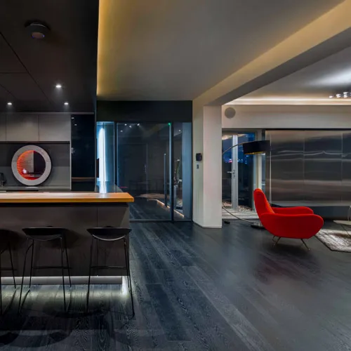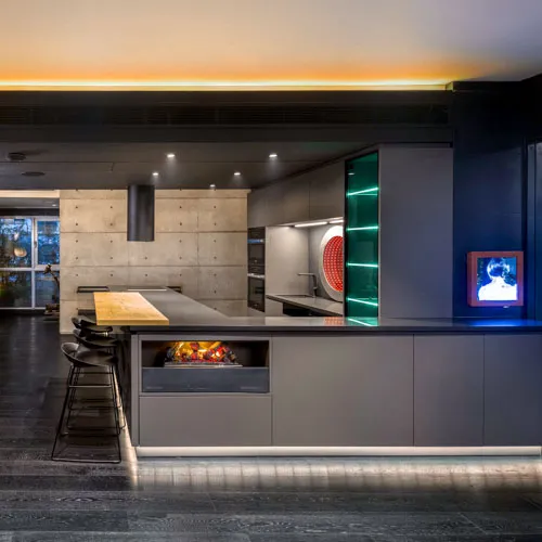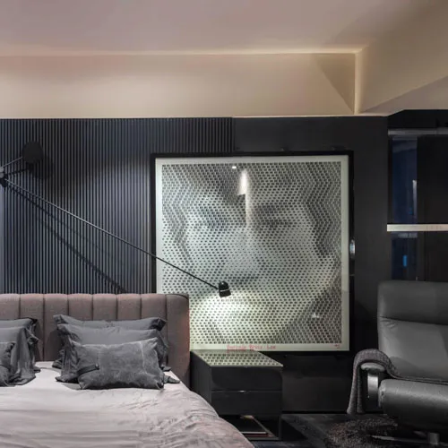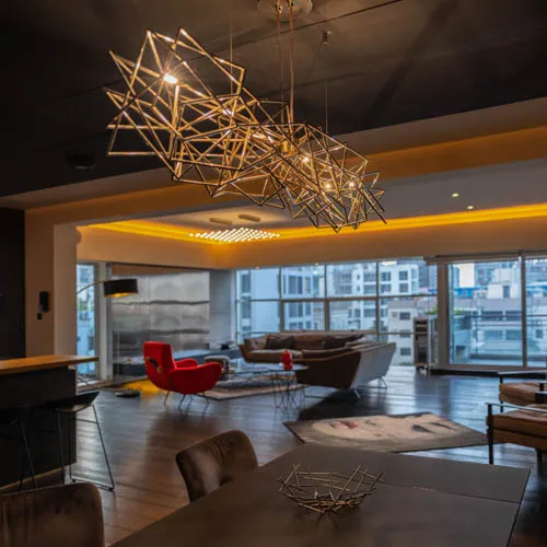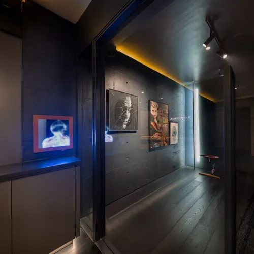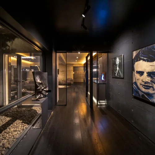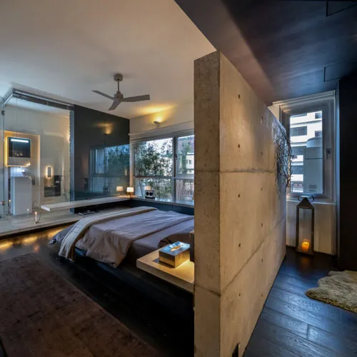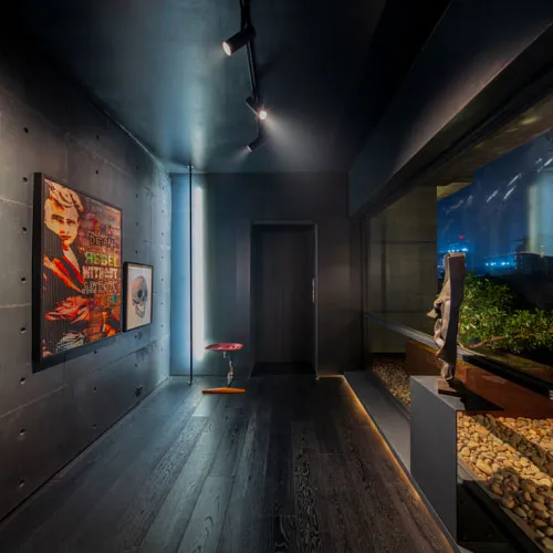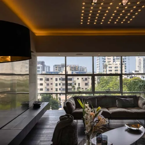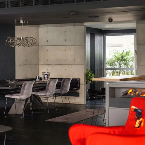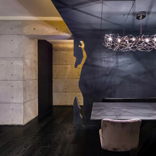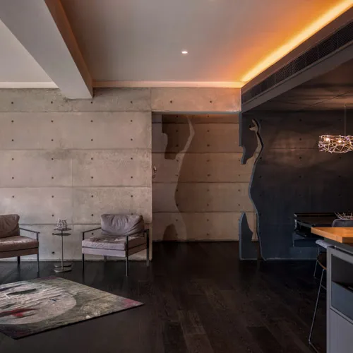 Crafted for an eclectic art collector, this Gulshan residence embodies a nuanced dialogue between expressive art and a modern interior design. Vivid pop art accents a canvas of exposed concrete and deep-toned hues, subtly elevating the space, curated by everyday collective items. The wide, spacious openings frame the city skyline, casting a luminous contrast against the charcoal gray interior palette. A performative kitchen flows into a versatile dining zone, where sculptural elements and theatrical lighting choreograph the moody ambiance. Fair-faced concrete paired with black timber flooring, in addition to an amalgamation of various metallic surfaces fuse to compose a boldly layered urban sanctuary.